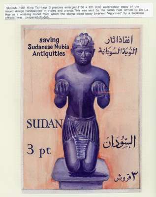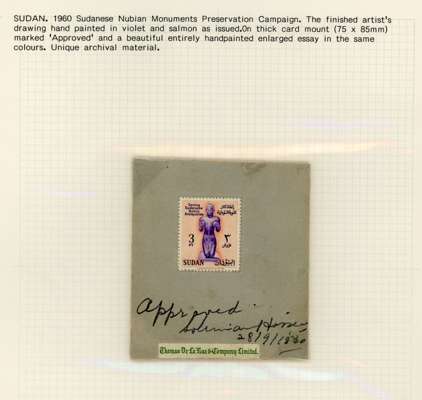 1961 Sudanese Nubian Monuments Preservation Campaign 3p "King Ta'rhaqa", the finished artist's drawing, hand-painted in salmon and violet as issued and mounted on a piece of thick card, 75mm x 85mm with De la Rue label at foot, endorsed 'approved' in m/s, signed by (Sudanese P.M.G.?) and dated 28/9/1960, accompanied by an enlarged watercolour (160mm x 221mm) in the same design, this was sent by the Sudanese post office to De la Rue as a working model, both are unique archival items.