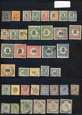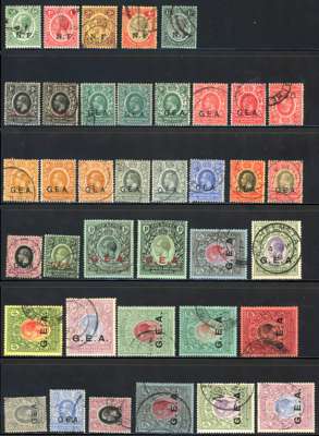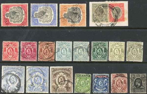 1917-31 used collection (82) with 1916 NF overprint set, then 1917 to 1r, plus 3r and 5r (others with faked or dubious cancels); 1921 set faked or dubious cancels; 1922-4 set to £1 but most better values with faked cancels, some (3s, 5s sideways watermark, 10s sideways watermark off centre) may be given the benefit of the doubt; 1927 to 3s. Also Uganda 1898 set