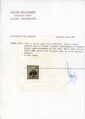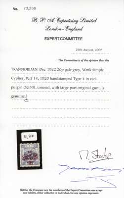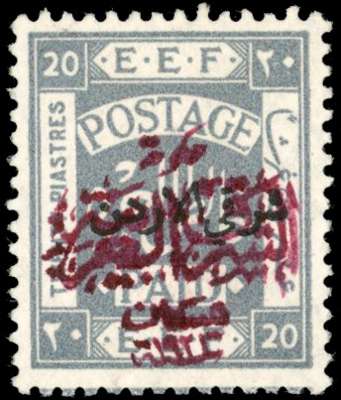 Transjordan SG 53 1922 20p pale grey type 4 overprint in red-purple mint