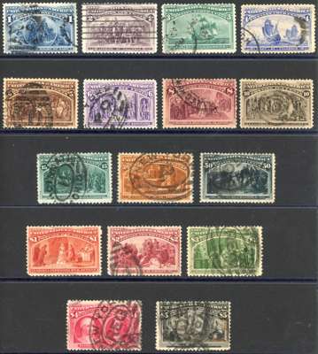 1893 Columbian Exposition set of sixteen values good to fine to 50c, $1 rounded bottom left corner and only very small cancel at base and unidentifiable line at top, $2 fresh used part ‘4’ numeral cancel with two thinned perfs at right side, $3 used with oval New York REG cancel with some reddish lines at bottom left, $4 similarly cancelled as well as $5, this with slightly rounded bottom right corner with red marks at right; variable centring, heavily used