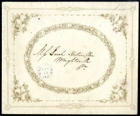 Undated 19th century Valentines envelope (25 x 20cm) to Wrightsville, PA, with blue Baltimore cds (Feb 13) containing a fine card with messages of affection, fine condition for such a large envelope