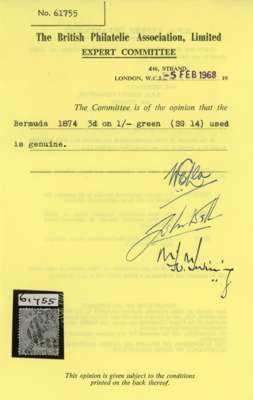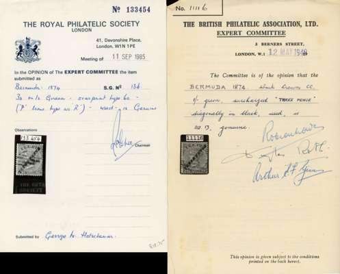 1874 3d on 1s green surcharges, the three listed Types, all lightly cancelled and certified. SG 13 (BPA, 1948), SG 13b (RPS, 1985) and SG 14 (BPA, 1968); the latter with a couple of blunt perfs at left, otherwise fine