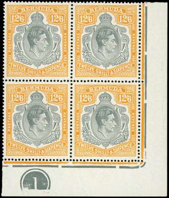 1948 (Jun) 12/6d grey and yellow-orange on chalky paper Plate block of four, unmounted o.g. Ex Dickgiesser. SG 120c, £520+
