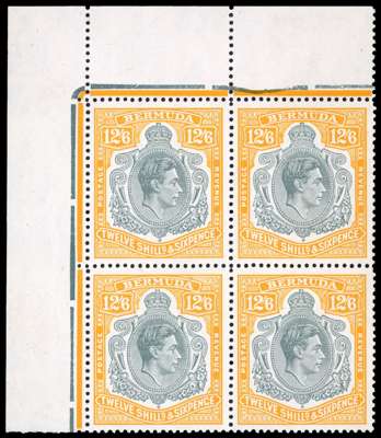 1949-52 12/6d perf 13 top left corner block of four, o.g., lightly hinged on the selvedge only. HPFs include #2a joined pearls, #14 scratched scroll. SG 120e, £360+