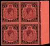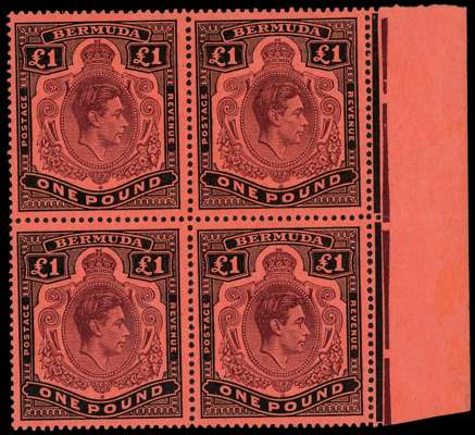 1945 £1 deep purple and jet black on salmon paper right marginal block of four with HPFs #36iii and 47, unmounted o.g. SG 121c, £240