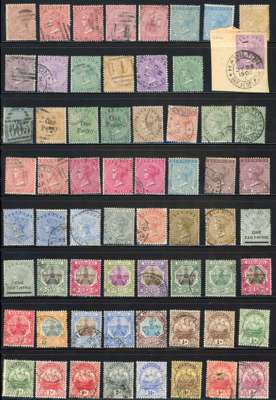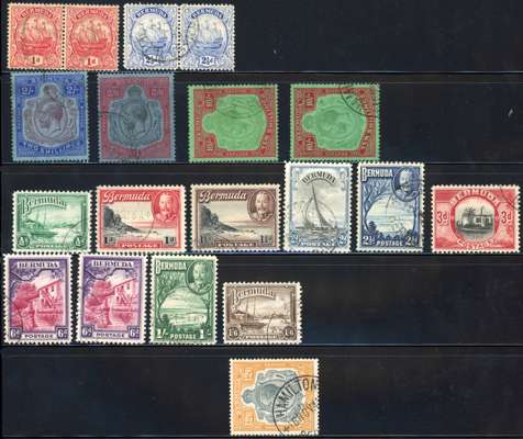 1865-1936 used collection (132) with 1865 with shades to 1s (no 3d orange), both perfs, plus 1d pale rose inverted watermark; 1875 1d surcharges, two x 1s, one with short perfs at top; 1883 with shades; Docks; Caravels; 1918 high values, the 4s and £1 fine, the 10s faked postmark, the 2s, 2s6d and 5s minor colour runs or fades; Tercentenary sets, 1922 Script set with shades; 1924 high values poor or faked cancels, and 12s6s Revenue-Revenue with faked Hamilton CDS. The stamps with defects/faked cancels not valued