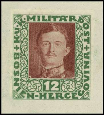 (Bosnia Herzgovina Circa 1917 composite proof, numbered ‘7’ consisting of a 12h green framed of the 1916 issue with a paste on revers of a King Charles I 20h red-brown to make-up a bi-coloured proof for an intended issue, fine and unusual