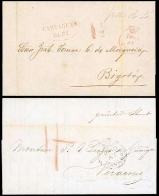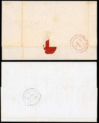1850s collection of seventeen entires each showing different Crowned Circles markings, including 1850 to London showing St George's Bermuda SG CC1 cat £8500 (one of less than twenty recorded examples), a good array of South American markings, comprising Rio De Janeiro SG CC3 cat £850, Valparaiso SG CC1 £450, Havana Colombia, Panama SG CC5 cat £1900, Santa Martha SG CC6 cat £1900, and Colon SG CC4 cat £4750 (one of only a handful of examples recorded), Central American and West Indies strikes with St. Thomas (Danish West Indies), Dominica SG CC1 £650, Vera Cruz, San Juan (Porto Rico), and entires for both Trinidad (SG CC1 cat £3000) and Tobago (SG CC1 cat £1500), with final covers from Plymouth, New Zealand and Guadeloupe used on letter to St. Pierre Martinique. Mixed condition, with mostly legible to clear markings, an interesting and rare lot. (17)