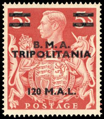 1948 BMA 120l on 5/- red, large part o.g. ‘T’ guide in hair, plus another prominently and diagonally across the hairline. Very scarce, SG T12 var