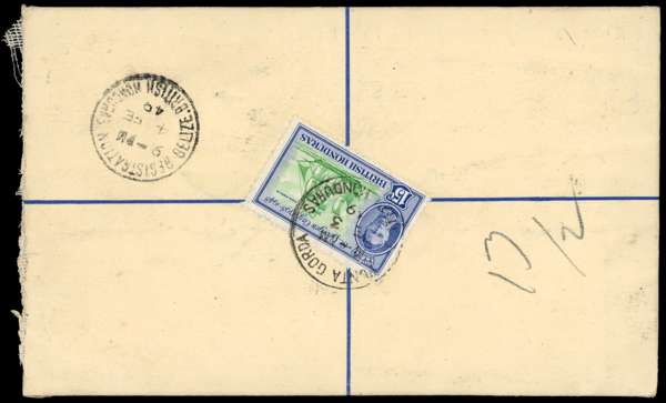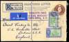 Postal Stationery. 1949 3d brown registered envelope to London with three added 15c St George's Cay (one on reverse), tied by Punta Gorda CDSs of FE 3. Punta Gorda registered label, Belize transit on reverse. Neat
