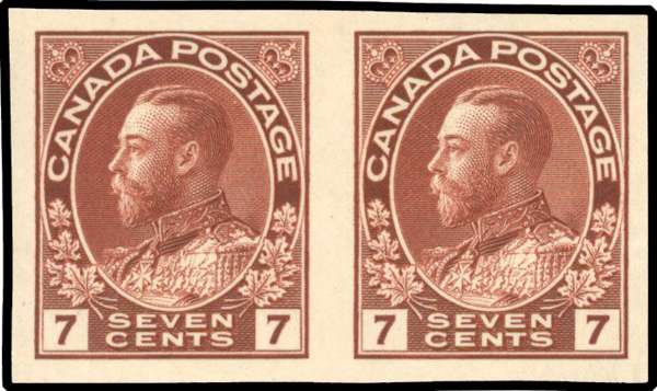 Canada SG 251 1922-31 7c red-brown imperf pair