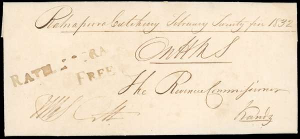 1832 (25 Feb) entire letter addressed to Kandy showing good and slightly over-inked straight-line “RATNAPOORA” and “FREE” (both unlisted in Oxley and Proud, possibly unique). Rare.
