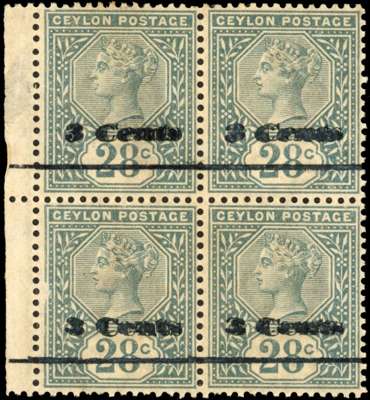 Ceylon 1892 3c on 28c slate with surcharge double block of four, SG 243a
