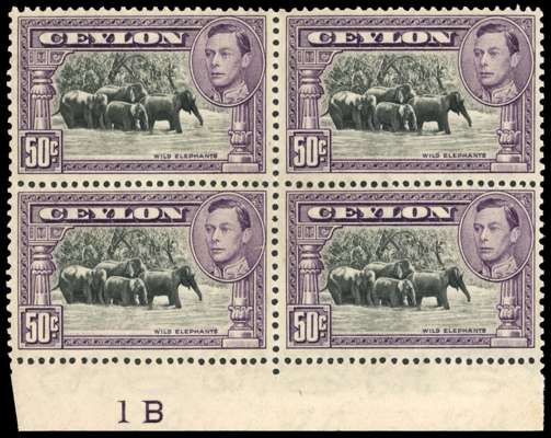 1938 50c perf 13 x 11½ lower marginal block of four with Frame Plate 1B large part o.g. with light central hingemark, gum streaky but good for this. Scarce. SG 394, £640