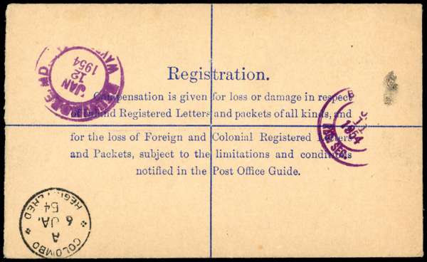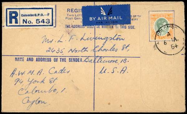 Postal Fiscal. 1954 postal stationery envelope Size G to Baltimore with 10r green and orange, Colombo CDS 6 JA 54. Neat, slight gum stains. SG F1