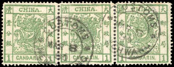 1878 Large Dragoon, thin paper 2½mm spacing 1ca deep green in horizontal strip of three, used showing strikes from ‘Customs Newchwang’ cds for MR 8 80, creasing piece and odd shortish perfs,otherwise fine, a scarce multiple. SG 1b; Chan 1b cat $1200+