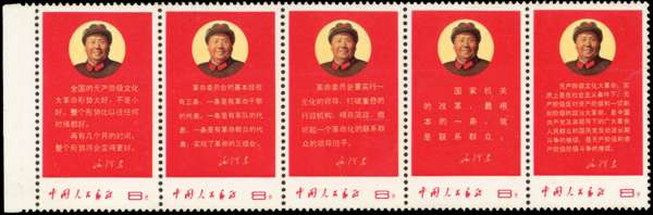 1968 Directives of Mao 8f brown, red and pale yellow, in left hand marginal se-tenant strip of five, mint unmounted o.g. light trivial tones, otherwise fine, scarce; a popular item. SG 2397-2401 cat £1400; W10 cat $4800