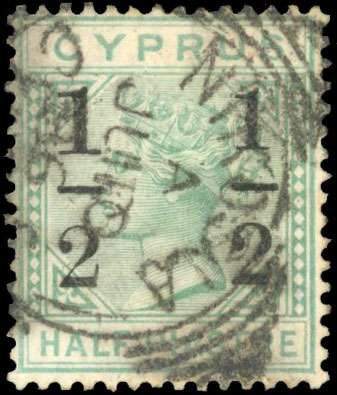 1886 '½' on ½pi emerald-green, wmk Crown CC, used with JU 10 Nicosia squared circle cancel, with R.2/5 large '1' at left. Light corner crease and faint traces of toning, still a presentable example of this rare variety. SG 28a, £2250