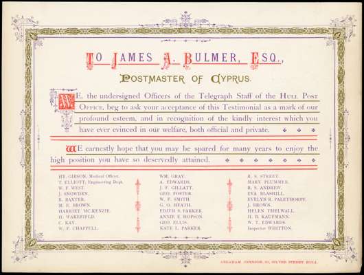 Telegraph; 1930 (circa) printed Testimonial (276 x 207mm) to James A. Bulmer, Postmaster of Cyprus, from the Officers of the Telegraph Staff of the Hull Post Office, printed in red, blue and gold, a little soiled at right, otherwise fine.