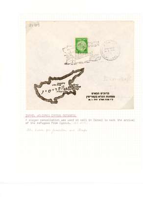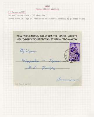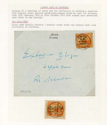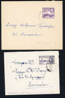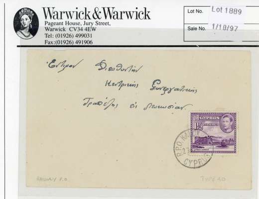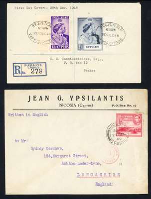 KG VI cover group including three Railway PO covers (RPO Angastina, Kalokoria, Karpashia); Censor 18 cover to UK, and Censor 10 on an AV2 cover to New York (this ex Ian Warn, on his written-up page); Silver Wedding pair on plain registered Paphos FDC; a cover (from Galata) and eight used loose 1p stamps or pieces, showing evidence of having been used as currency (which was allowed during 1941-2) and subsequently used for postal purposes; and a 1949 Israel cover with Tel Aviv slogan cancel marking the arrival of Cypriot refugees