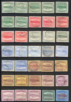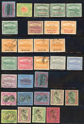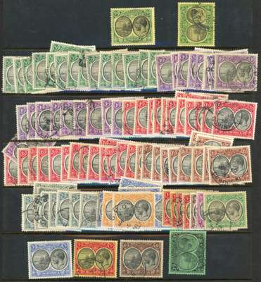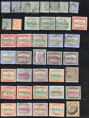 1974-1935 used collection (250+) with 1874 trio, two of each plus extra 1s; 1877 set at least two of each; 1882 bisects with two extra pairs; 1883 trio; 1886 surcharge (SG 17, 19) two of each; 1885 set to 6d; 1903 set; 1907 set; 1908 set with variants but 2s6d and 5s faked postmarks; 1921 set, 2s6d faked postmark; 1923 set (many low values) , but all high values save Script 5s have faked postmarks