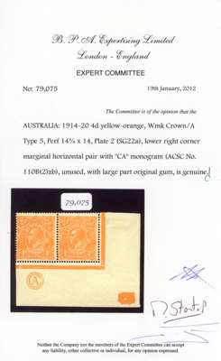 1914-20 4d yellow-orange, wmk 5, lower right corner horizontal pair from plate 2 with ‘CA’ monogram, mint large part o.g., small marginal thin at right otherwise fine and very scarce. BPA cert (2012). SG 22a (BW 110B(2)zb, cat A$1500)