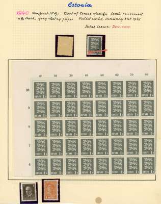 Estonia 1940 1s Arms on thick paper in corner marginal block of 40 hinged in margin only, stamps unmounted o.g.