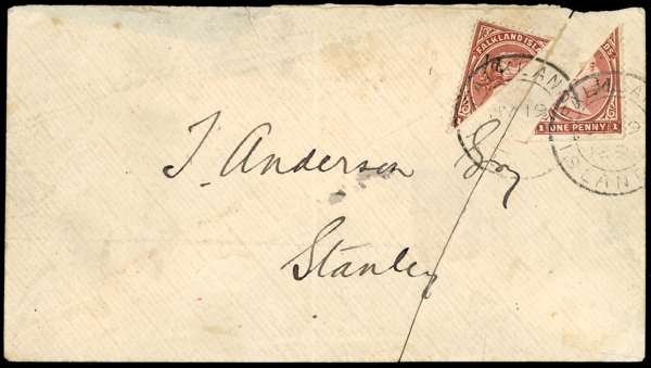 † Falkland Islands SG 14 1891 cover with two ½d bisects