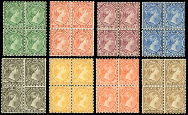 Falkland Islands SG 17a/38 1891-1902 set of 8 in mint blocks of four