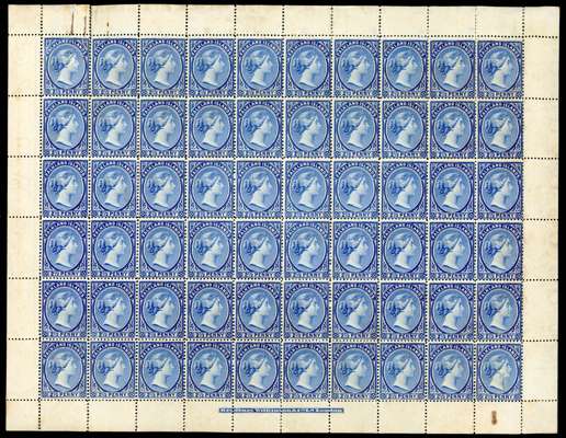 1891-1902 2½d deep ultramarine (18 Sep 1901 printing), complete sheet of 60 (6x10) with imprint at foot, o.g. (mounted on two stamps only). Stains affecting three stamps at NW and SE corners (caused by paper clip), and some split perfs, but a very rare and impressive showpiece. SG 30c, cat £3000+