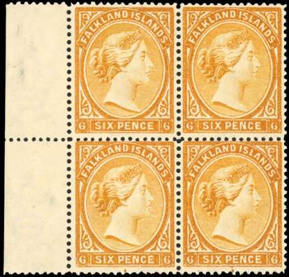 1891-1902 6d orange-yellow, Nov 1891 printing, (watermark reversed as usual) left marginal block of four (with guide dots at foot demonstrating position is R5-6/1-2) fresh and very fine o.g., the top pair lightly hinged and the lower pair with insignificant traces of offsetting. A lovely positional proving piece with exceptional colour. SG 33x cat £360