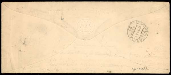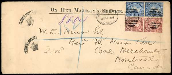 1895 registered OHMS envelope to Canada, bearing 1891-1902 1d claret (oxidised) and 2½d ultramarine vertical pairs, tied by ‘F.I.’ obliterators with two strikes of the ‘Crown / REGISTERED’ h/s at left, London registered oval (20 Nov) alongside and backstamped with Montral arrival cds (NO 28); minor edge wrinkling still a fine and rare double rate cover.