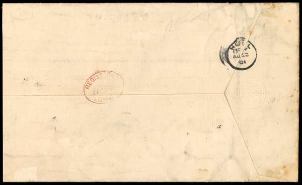 1901 large part linen-lined registered cover (reduced at left) from Government House (embossed Royal Arms on flap), to Hull, UK, franked by 1898 2s6d deep blue, tied by part strike of Type F4 ‘Falkland Islands’ cds with ‘(Crown)/Registered’ mark below, and red oval London transit (22 AU 01) alongside, with London and Hull arrival backstamps (both 22 AU). Endorsed in pencil under stamp ‘Under 5½ oz’ which would have required 11d postage + 2d registration but this is undoubtedly a commercial usage, and the excess may be explained by insurance fees. Slight faults (stamp with minor creasing), still an attractive and very rare usage. SG 41