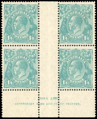 1926-30 1s4d turquoise, wmk 7, perf 13½x12½, lower marginal interpane block of 4 with 'JOHN ASH' imprint, mint large part o.g., lightly folded as often and one short perf but a very scarce multiple with superb provenance. SG 104 (BW 130z, cat A$3000)