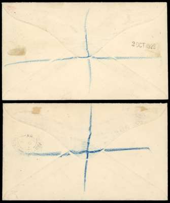 1927 pair of registered ‘Wilson’ covers bearing 3s slate-green and 10s red on green paper, each cancelled at Fox Bay, respectively on 3 JA and JY 14. Neat. SG 66, 68