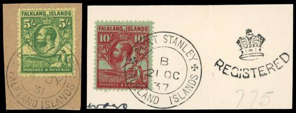 1929 ‘Whale and Penguin’ 5s and 10s, each used on piece, the 10s with a fine strike of the (Crown)/REGISTERED handstamp alongside. SG 124-5