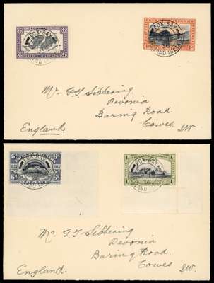 1936 two envelopes, one with Centenary 3d and 4d, the other with 6d and 1s, the latter pair lower right corner examples, used on envelopes to the Isle of Wight with very fine strikes of the Fox-Bay Type FB1 CDS of AP 15 36. Neat and fresh. SG 133-4