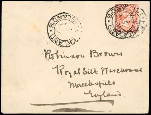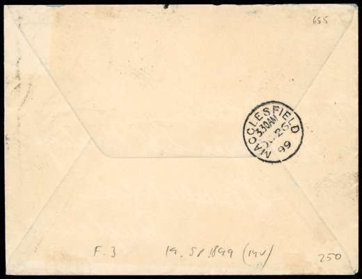 1899 envelope with QV 1d tied by Type F3 CDSs of 19 SP 1899 (year inverted), addressed to Robinson Brown, Royal Silk Warehouse, Macclesfield. Correctly rated. Macclesfield arrival on reverse