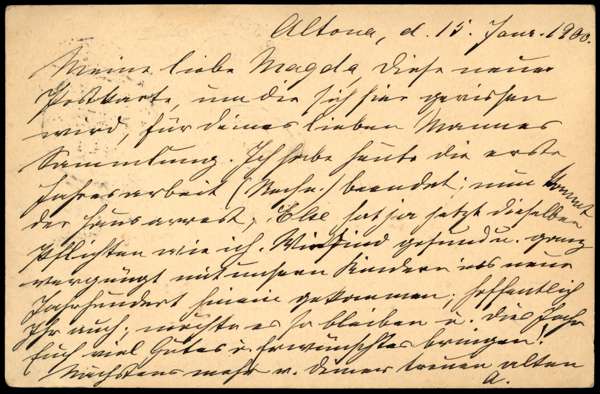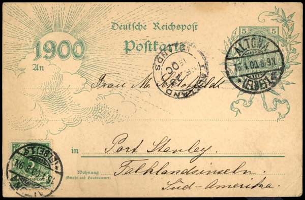 1900 incoming postal stationery postcard from Germany, uprated by 5pf, Altona CDSs of 15.1.00. Falkland Islands arrival of FE 28, the year date with large ‘OC’ for ‘00’. Slight soiling, but a scarce incoming item