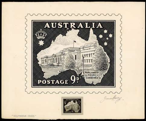1937 (c.) Essay for a proposed 9d pictorial, depicting the Parliament House, Canberra within a map of Australia, with the "Southern Cross" at right and a crown over single star at left, in black ink on unglazed card, touched up with Chinese white in places, approx. 174mm x 143mm, by the prolific New Zealand stamp designer James Berry and signed below design, also endorsed "SOUTHERN CROSS" in pencil at lower left, a photographic 'stamp size' reproduction has been affixed below the design, accompanied by a contemporary typewritten slip suggesting this could be part of a new definitive series with a common frame design but varying centres, almost certainly unique, most attractive!