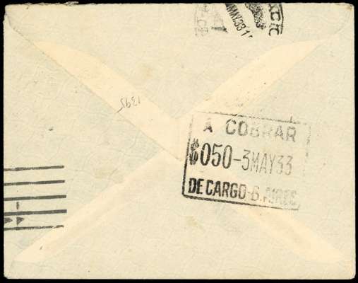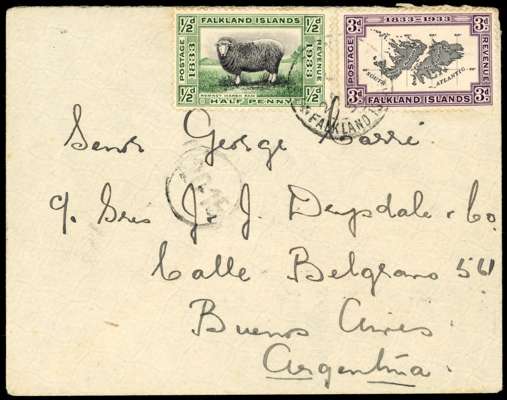 1922 (24 AP) cover from Port Stanley to Buenos Aires, franked by 1933 Centenary ½d and 3d, tied by part despatch cds, with part arrival cds and boxed ‘A COBRAR/$050’ dated postage due mark of 3 MAY 33'; the stamps not being recognised by the Argentine authorities. Neat and scarce.