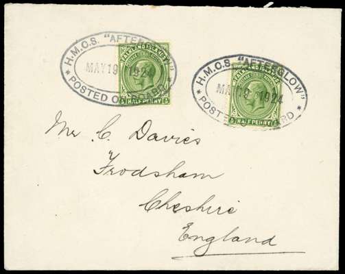1924 ‘Davies’ envelope bearing two ½ds cancelled by individual very fine strikes of the oval H.M.C.S. “AFTERGLOW” handstamp in black, very neat. SH SC 5