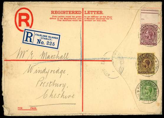 Postal Stationery. 1925 ‘Marshall’ use of formula registered envelope (7 x 5") bearing ½d, 2d and 2½d tied by individual strikes of Port Stanley CDSs 29 OC (5d double rate). Some peripheral wear and soiling, still scarce and not unattractive