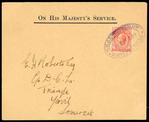 1926 OHMS envelope to Yeovil bearing 1d cancelled by full strike of the oval H.M.C.S. “AFTERGLOW” handstamp in violet, date 28 JAN 1926. Port Stanley backstamp 2 FE