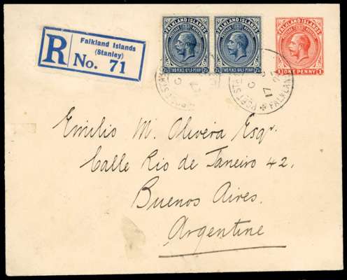 Falkland Islands 1927 1d postal stationery envelope to Buenos Aires
