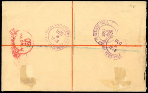 Postal Stationery. 1928 formula registered envelope size G to Los Angeles, bearing KG V 6d tied by Port Stanley Type PS1A CDS of 5 OC 28. Registration label across flap with Los Angeles violet CDSs. Neat and attractive