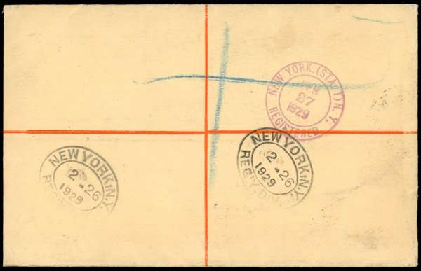 Postal Stationery. 1929 formula registered envelope size G to New York, bearing 6d yellow-orange tied by Port Stanley Type PS1B CDS of 9 JA. Registration label across flap, with London transit and New York arrival marks also on front