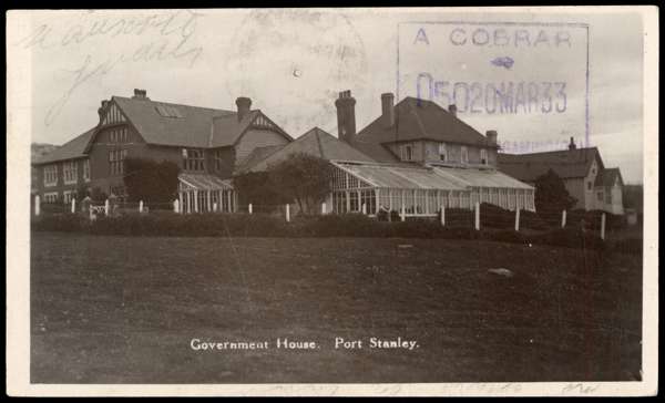 1933 picture postcard of Government House, Port Stanley, addressed to Marfiner, Argentina. Correctly franked at the 1½d postcard rate by the Centenary 1½d, cancelled by light Port Stanley CDS. The stamp not recognised by the Argentine Post Office; the card bears a boxed violet handstamp A COBRAR/ 050 20 MAR 33' on the face, with a small black ‘T’ on reverse. Buenos Aires transit and Marfiner arrival of 24 MAR. Fine, an extremely rare example of a postcard taxed in this way; ex Stanley