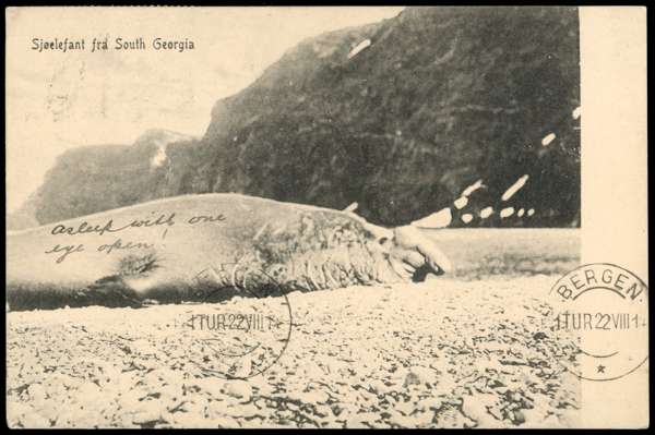 South Georgia. 1914 picture postcard (Elephant Seal, legend in Norwegian). Bears two KE VII ½ds (correct rate), tied by South Georgia CDS of JY 4 14, addressed to Norway. Unusual usage