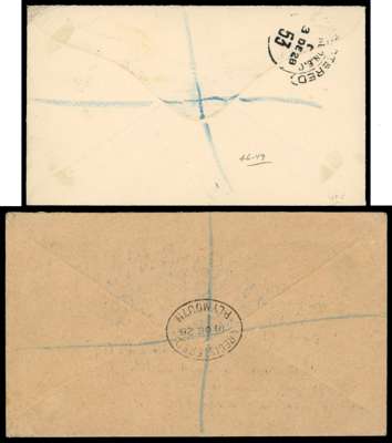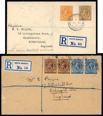 South Georgia. 1928 registered ‘Wilson’ envelope bearing 6d and 1s, tied by single strike of code C CDS of SP 12, London transit on reverse; and another 1928 envelope with South Georgia registered label, bearing horizontal pairs of the 2½d deep steel-blue and 2½d purple on yellow paper; evidently uncancelled at South Georgia and postmarked in transit by Liverpool registered datestamps of 19 DE, backstamped Plymouth transit of 18 DE. Unusual